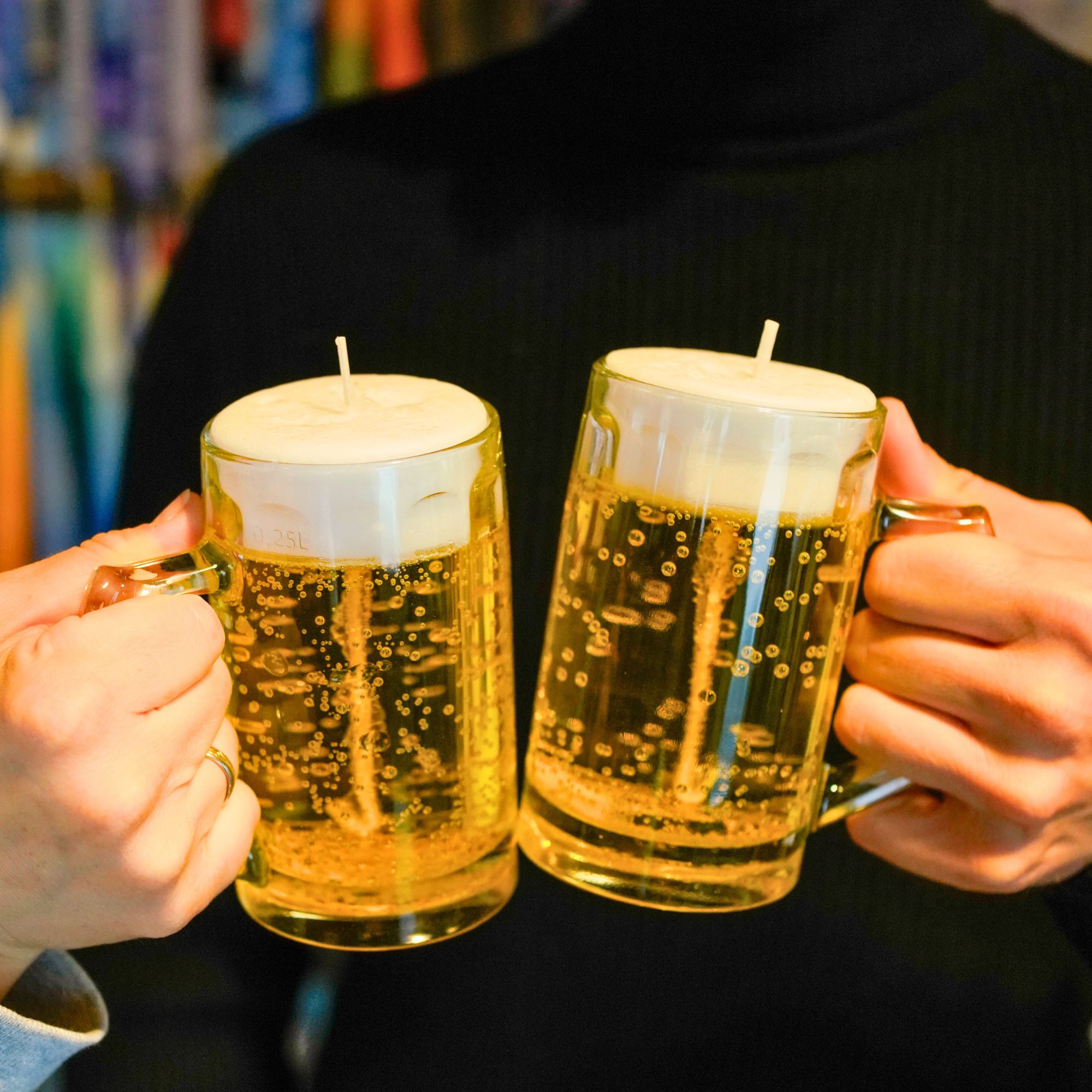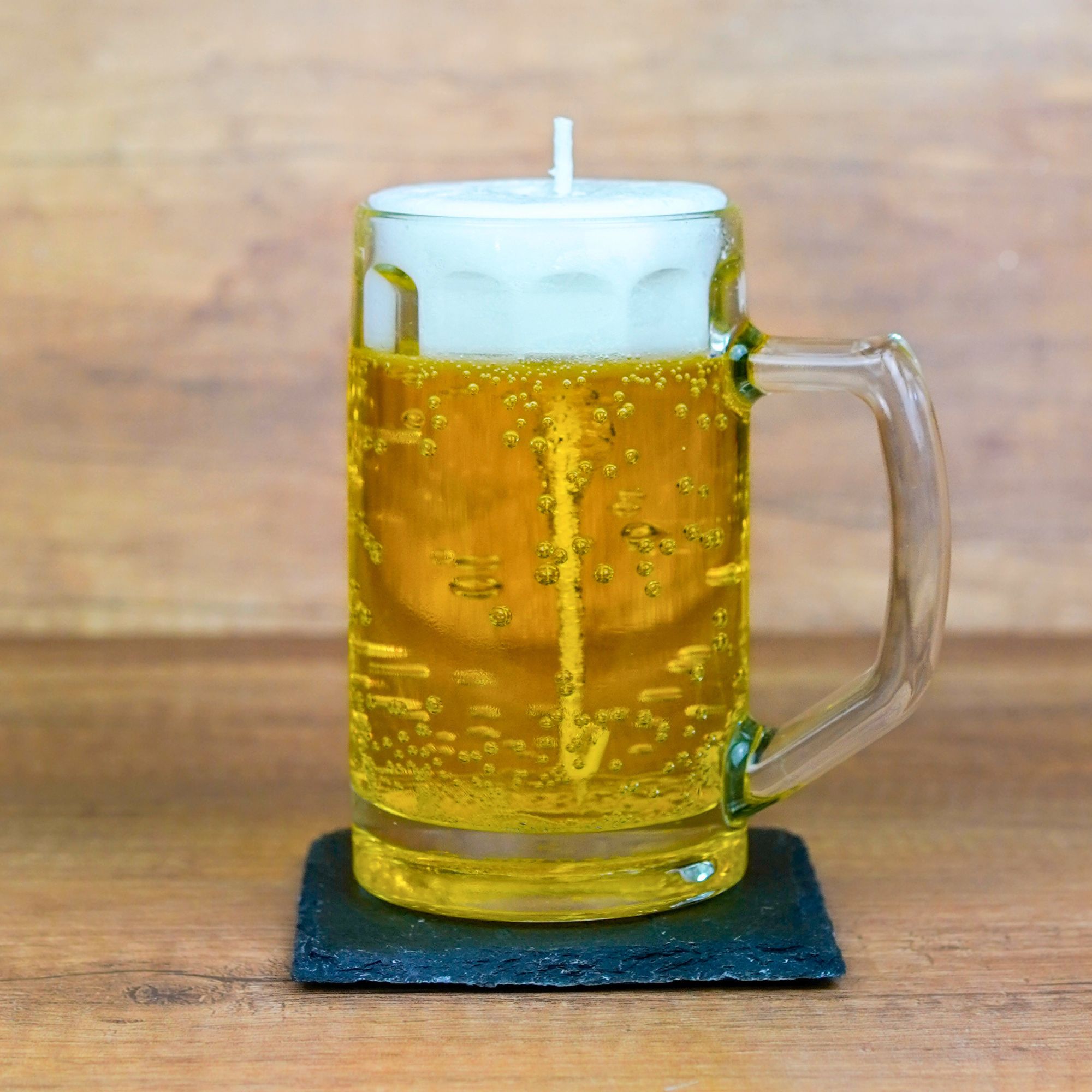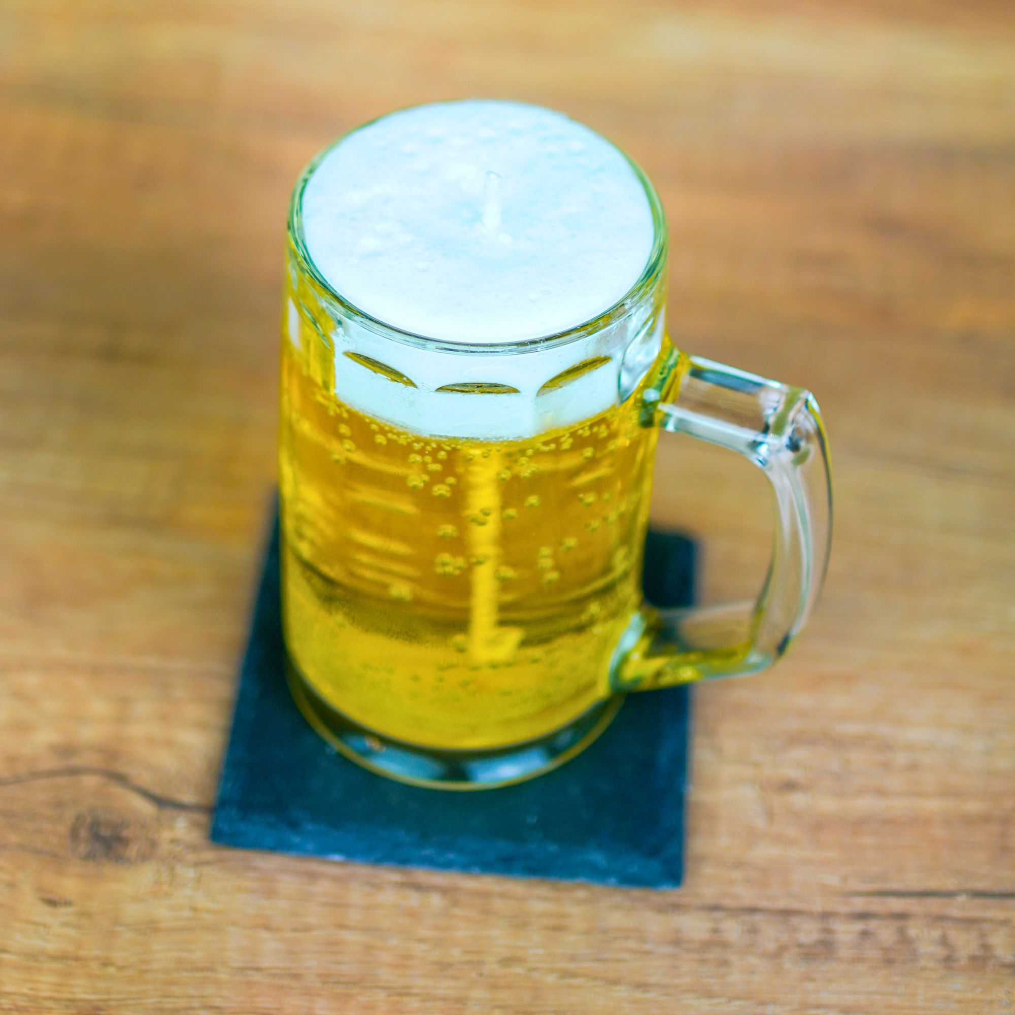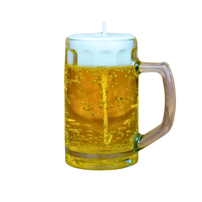 Das transparente Glas, die goldene Farbe und die detailreiche Schaumschicht lassen die Kerze wie ein frisch gezapftes Bier aussehen.