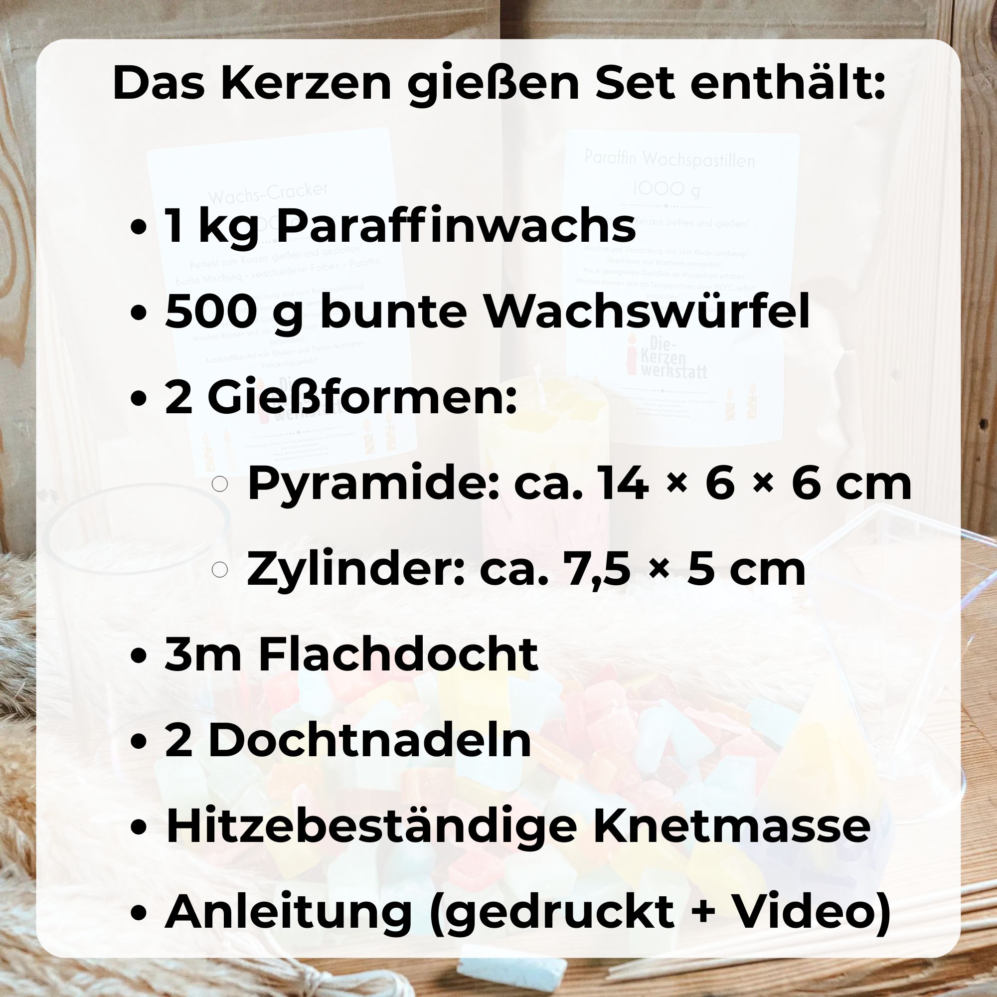 Unser Set kombiniert wiederverwendbare Profi-Gießformen, handgefertigte bunte Wachswürfel und eine einfach erklärte Videoanleitung.