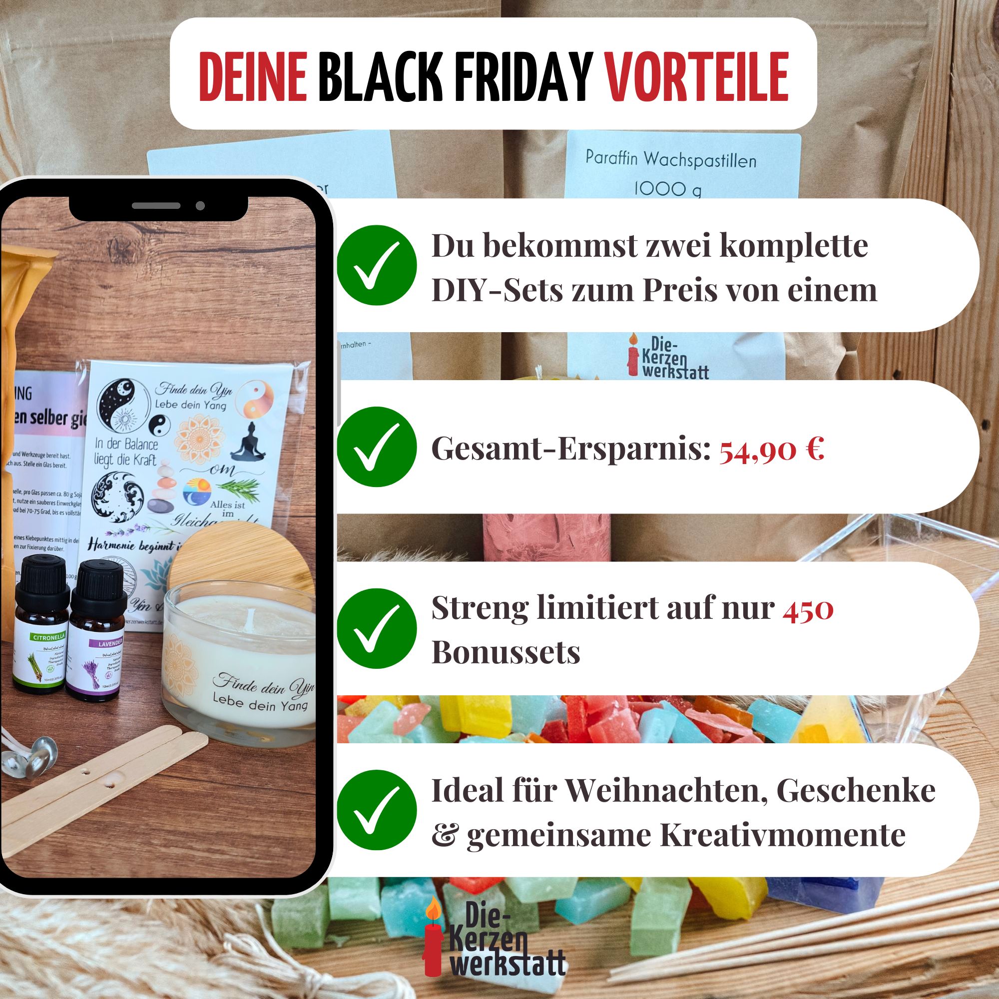 Kreiere mit Leichtigkeit farbenfrohe Kerzen – sauber, kreativ und mit garantiertem Bastelerfolg. Du bekommst Wachs, Formen, Dochte, bunte Wachswürfel und eine klare Anleitung – alles, was du brauchst, um sofort zu starten. Ob mit Familie, Freund:innen oder allein – Kerzengießen wird zu einem Moment voller Ruhe, Freude und Stolz. Im Vergleich zu vielen anderen Sets gelingt das Gießen einfacher und sauberer – für farbenfrohe Kerzen, die aussehen wie kleine Kunstwerke. Mit dem DIY-Kerzen-Gießset bringst du kreative Momente und farbenfrohe Ergebnisse in dein Zuhause. So entstehen Schritt für Schritt wunderschöne Unikate, die du verschenken oder selbst genießen kannst. 1 kg Paraffinwachs 2 Gießformen: 500 g bunte Wachswürfel Flachdocht & Dochtnadeln Hitzebeständige Knetmasse Anleitung (gedruckt + Video) Zusätzlich zum regulären Set erhältst du das komplette DIY Duftkerzen Set „Yin & Yang“ GRATIS dazu 400 g hochwertiges Sojawachs 2 ätherische Öle (Lavendel & Citronella, je 10 ml) 2 stilvolle Gläser mit Bambusdeckel (je ca. 105 ml) 5 Dochte + Klebepunkte 2 Holzstäbchen zur Dochtzentrierung Liebevoll gestaltete Schritt-für-Schritt-Anleitung Ergibt ca. 5 harmonisierende Duftkerzen. Lavendel entspannt – Citronella belebt. Die Gratiszugabe endet automatisch, sobald alle 450 Sets vergeben sind. Ob entspannter Nachmittag mit Freund:innen, bunter Familienmoment oder deine persönliche kreative Auszeit: Während eine Kerze auskühlt, kannst du schon das nächste Design planen – Und das Beste: Die Gießformen sind wiederverwendbar, sodass du jederzeit neue Ideen umsetzen kannst. Überrasche deine Liebsten mit einem kreativen Erlebnis zum Verschenken – Ideal für: Weihnachten Geburtstage Mädelsabende Familienbasteln kreative Me-Time Sauberes Gießen ohne Wachsspritzer oder Schichten-Chaos Wiederverwendbare Formen & nachfüllbares Material GRATIS Yin & Yang Duftkerzen-Set (Wert 34,90 €) – limitiert auf 450 Stück Für Anfänger:innen und Bastelfans jeden Alters geeignet Made in Germany – handgefertigt in unserer Dresdner Kerzenwerkstatt Zwei DIY-Erlebnisse zum Preis von einem Unsere Sets werden in liebevoller Handarbeit hergestellt.Black Friday Special: