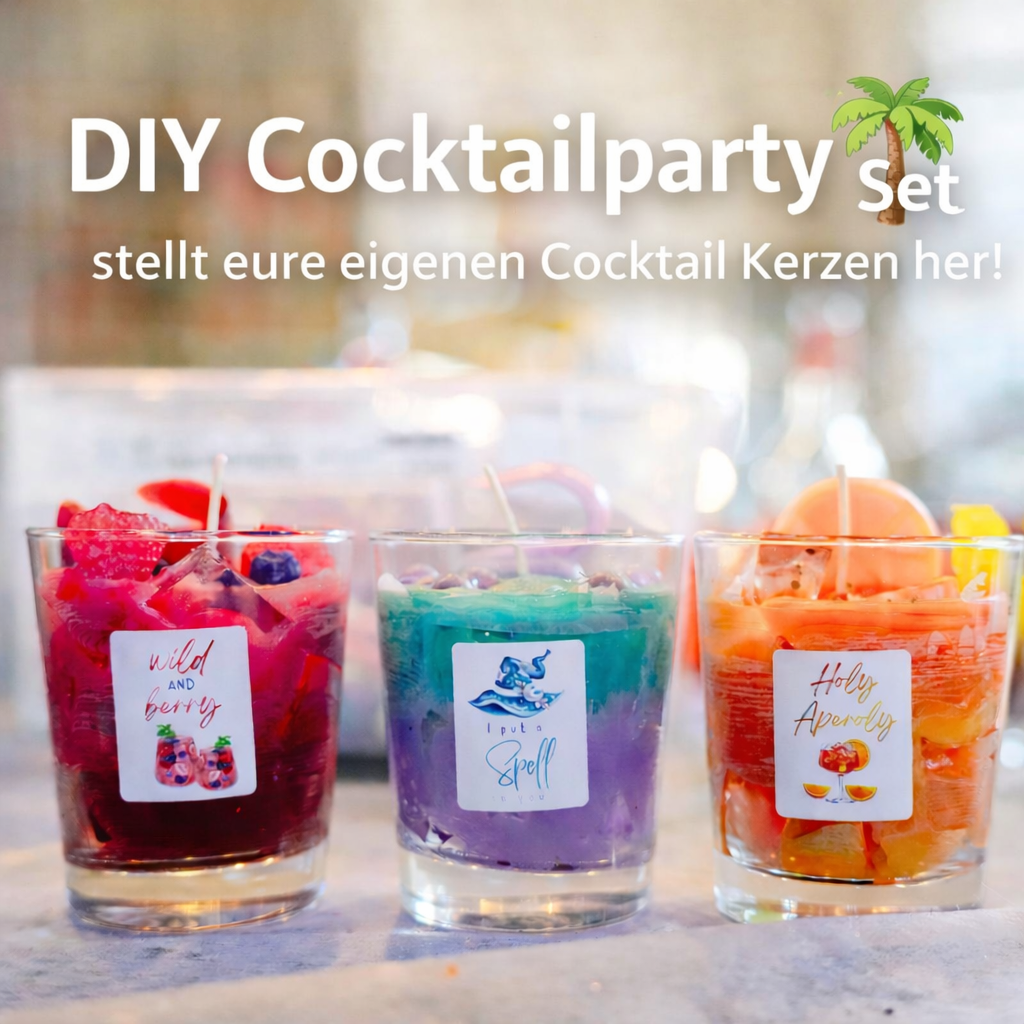 Mit diesem umfangreichen Cocktailkerzen Party Set gestaltet ihr gemeinsam bis zu 12 individuelle Cocktailkerzen in leuchtenden Farben und Kerzen-Drink-Optik. Ob Mädelsabend, Kindergeburtstag, JGA oder Familienfeier – dieses Set verbindet Kreativität, gemeinsames Erlebnis und beeindruckende Ergebnisse. Das Besondere: Gemeinsam kreativ werden 12 individuelle Cocktailkerzen gestalten Wachsfrüchte selber gießen Realistische Cocktail-Optik Große Farb- & Duftvielfalt Bastelerfolg garantiert Zum Selbergießen: Zusätzliche Deko zum direkt Starten: → Einfach, kreativ und perfekt aufeinander abgestimmt Ihr liebt eure Cocktailkerzen – oder ihr bekommt euer Geld zurück. Ohne Wenn und Aber. Sichert euch jetzt euer Cocktailkerzen Party Set und erlebt gemeinsam kreative Zeit mit echten Wow-Ergebnissen.Das perfekte DIY-Set für kreative Gruppen – Cocktailkerzen selber machen