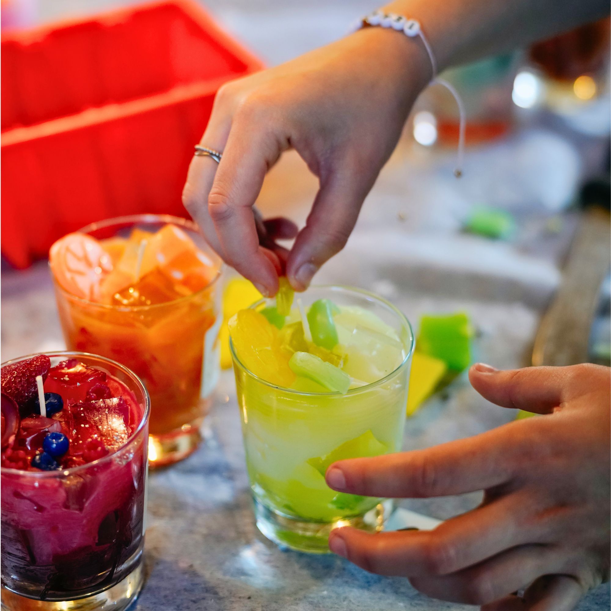 Jede Kerze wird ein Unikat – mit Farbverlauf, Eiswürfel-Optik und fruchtiger Deko.