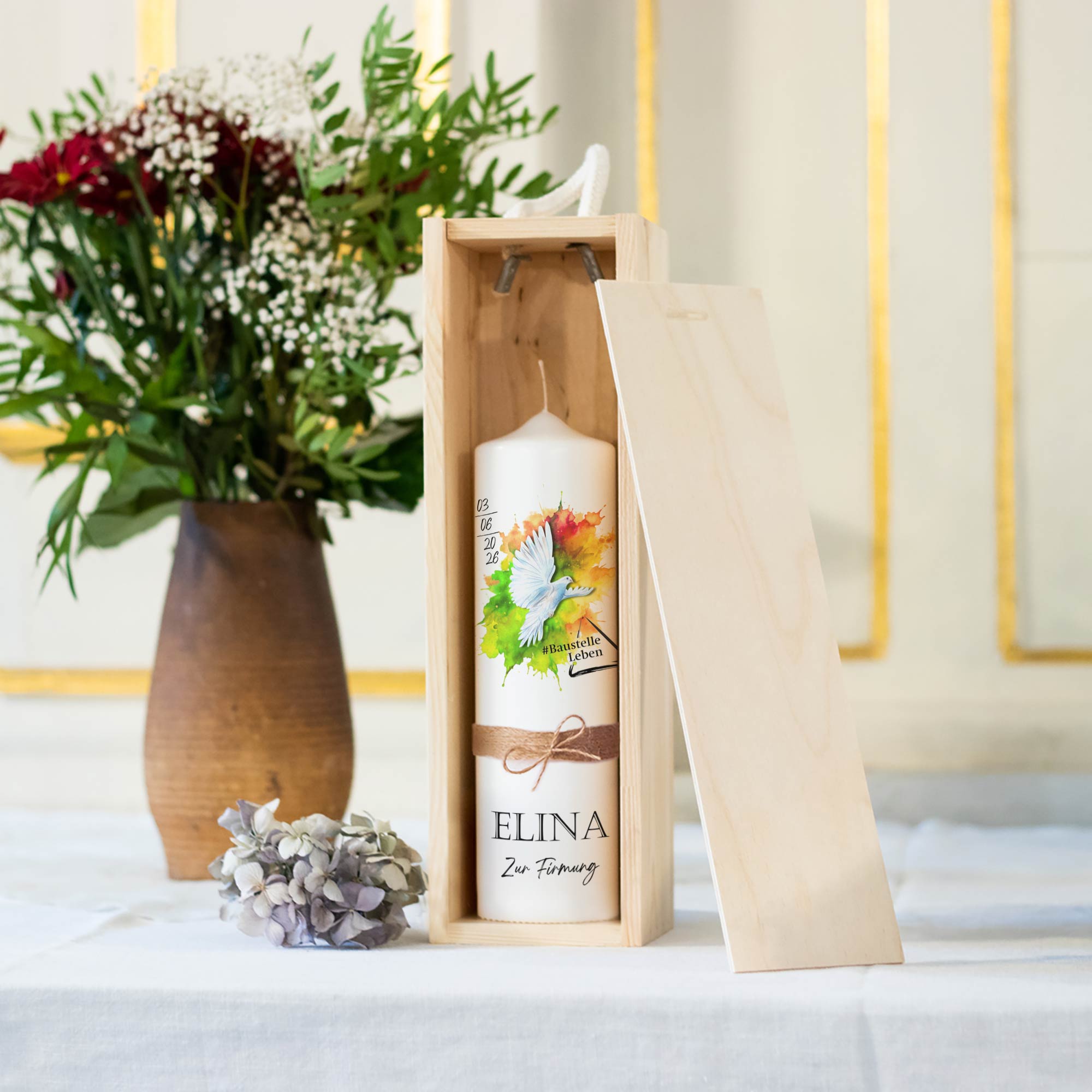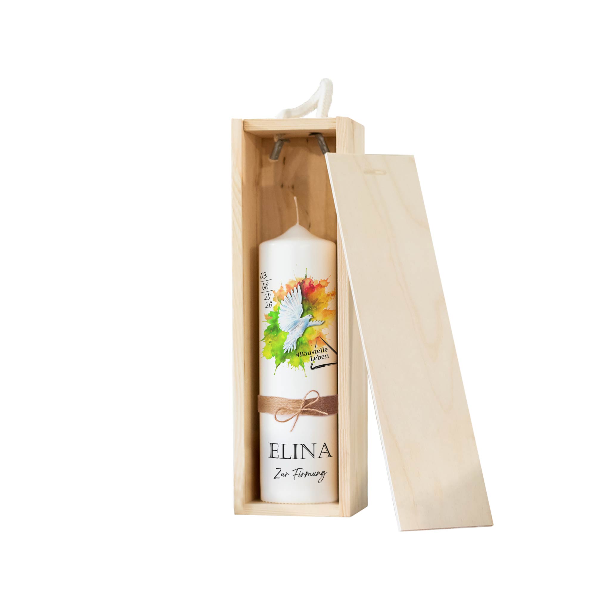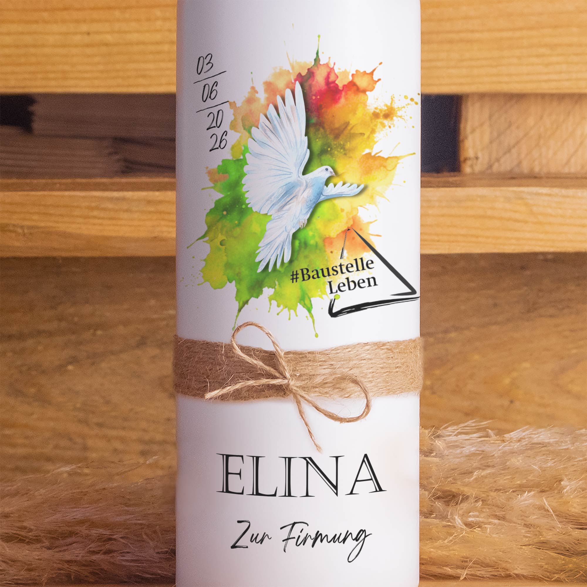 Das ausdrucksstarke Motiv mit Taube und farbigem Aquarell-Hintergrund verbindet christliche Symbolik mit einem zeitgemäßen Design und macht die Kerze zu einer besonderen Erinnerung an die Firmung.