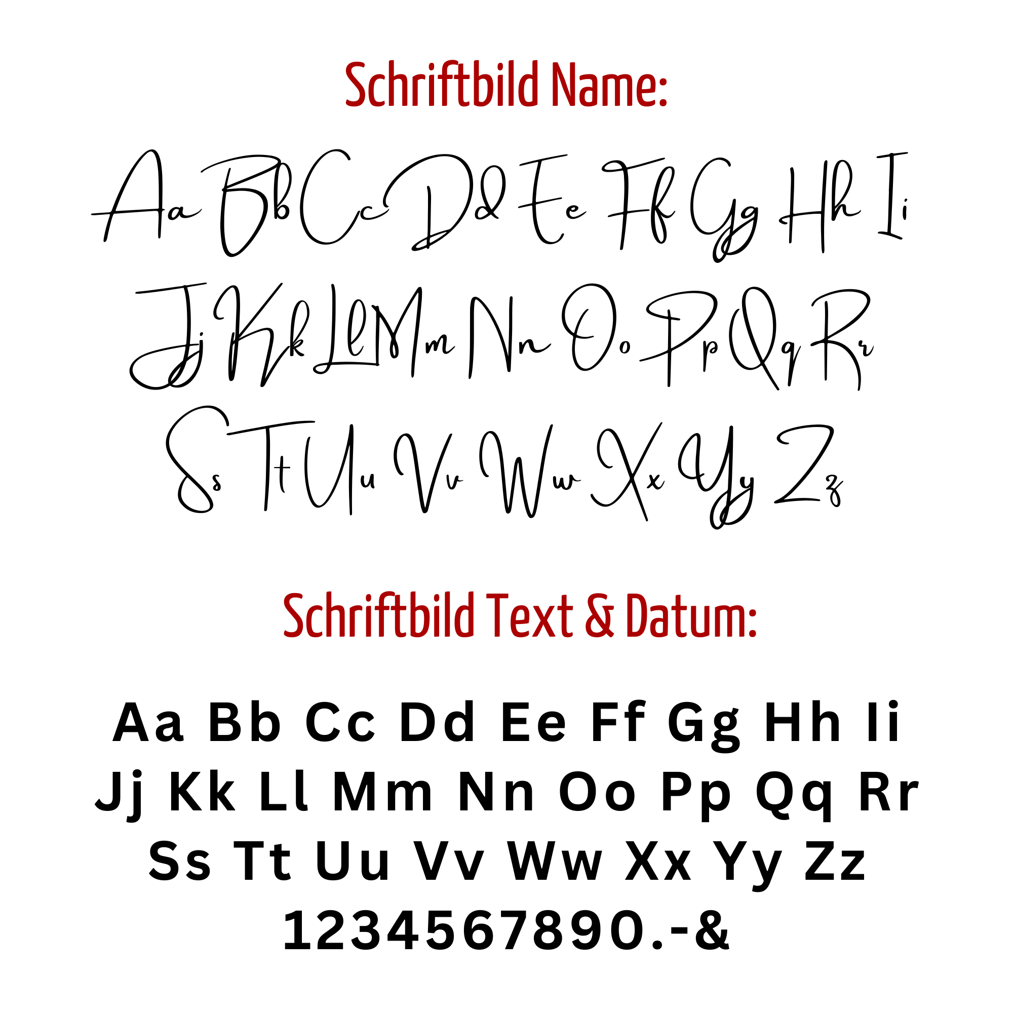 • Individuell gestaltbar mit Name, Datum und frei wählbarer Designfarbe