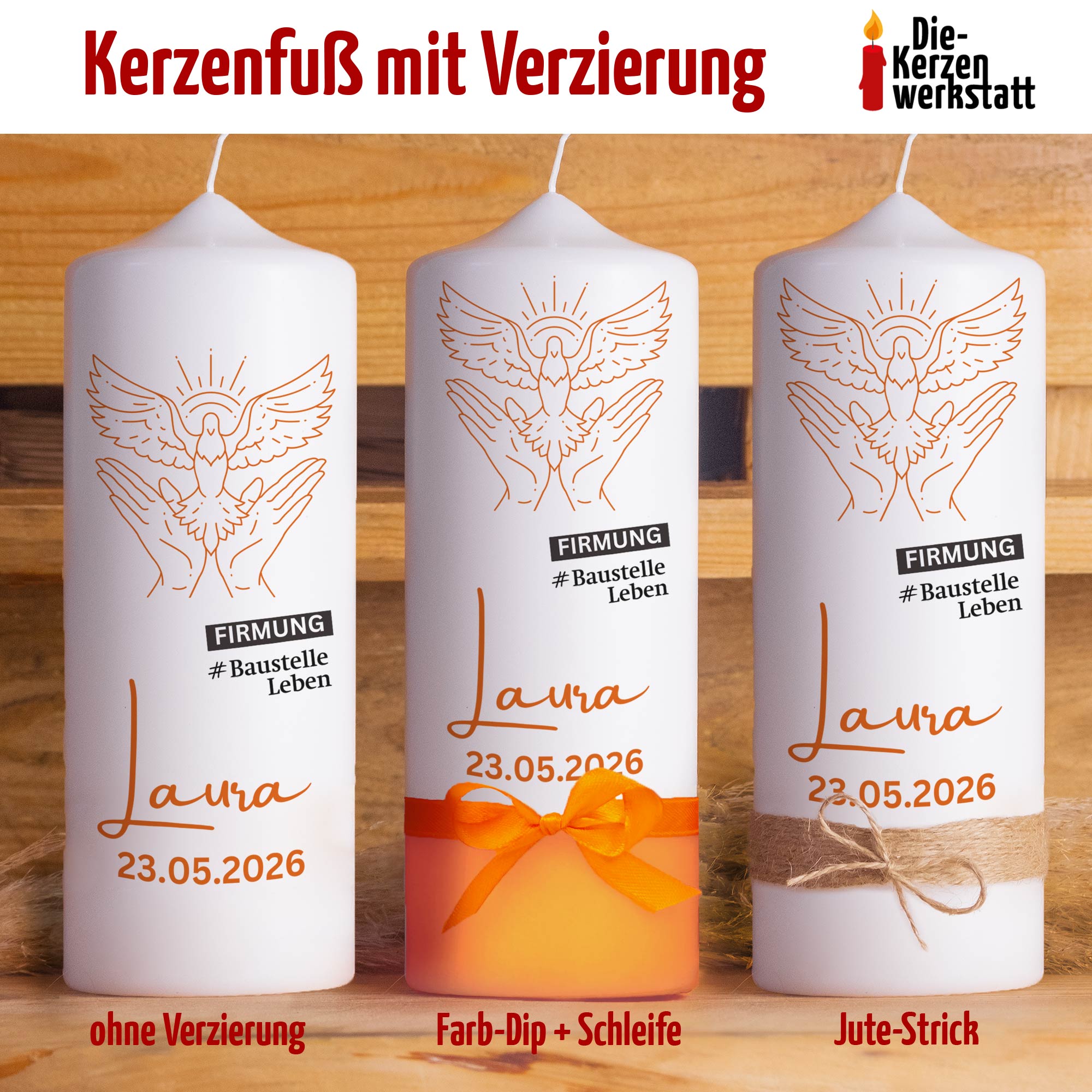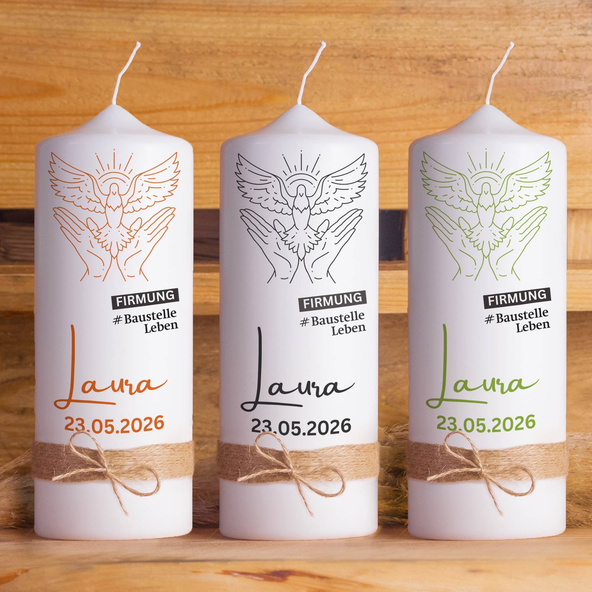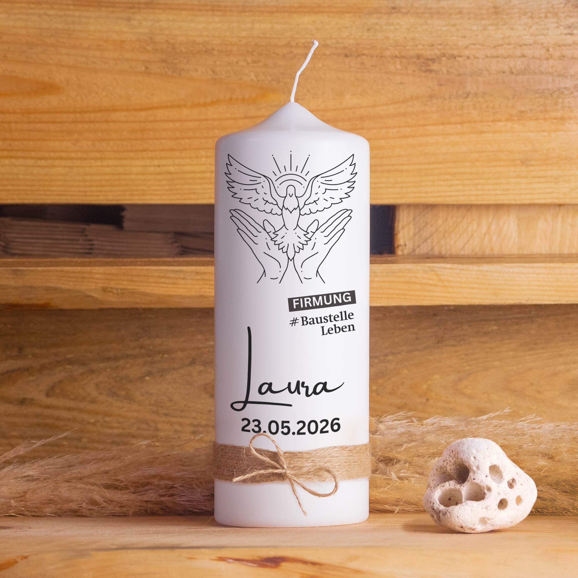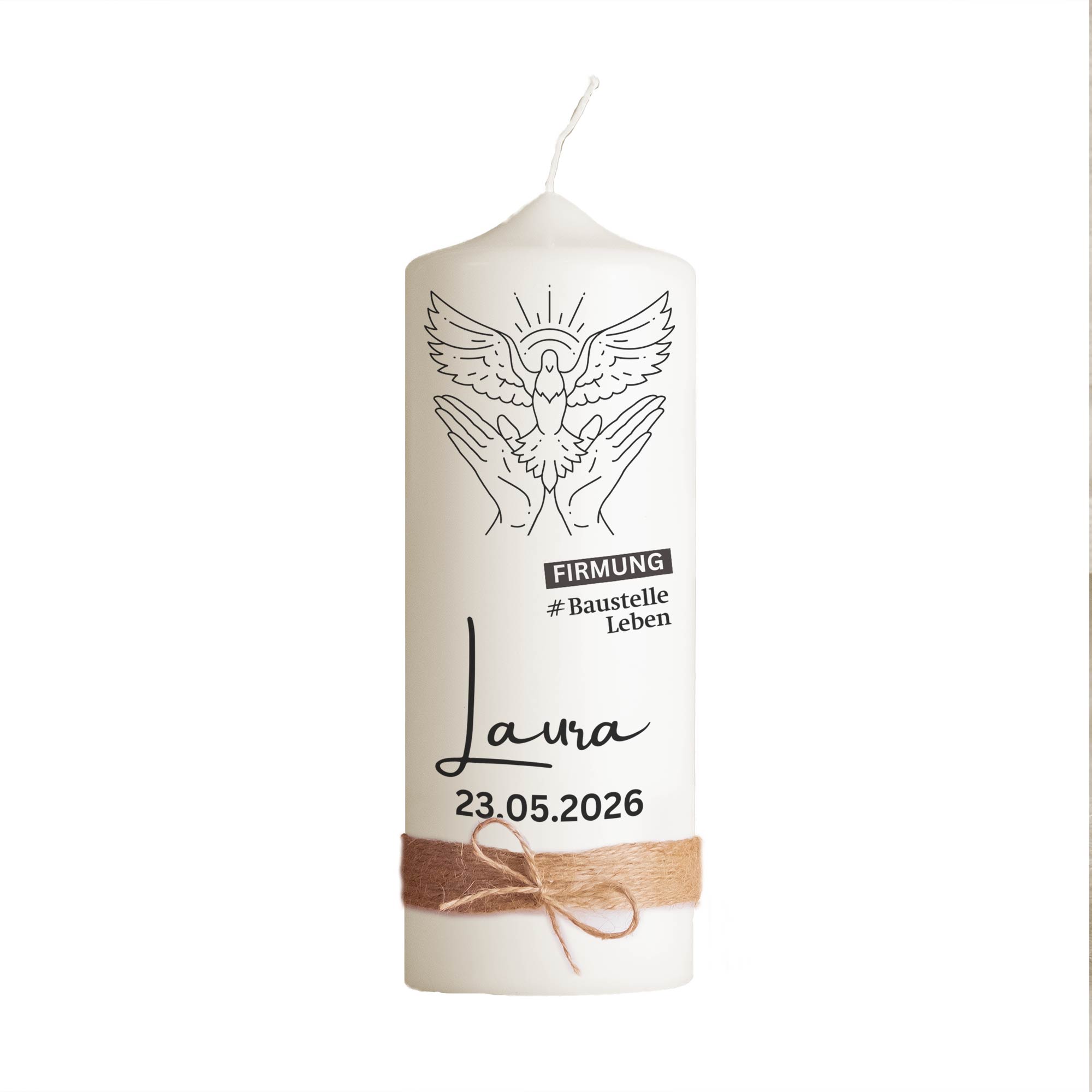 Firmungskerze „Taube Baustelle Leben“ 2026 | personalisiert mit Name & Datum