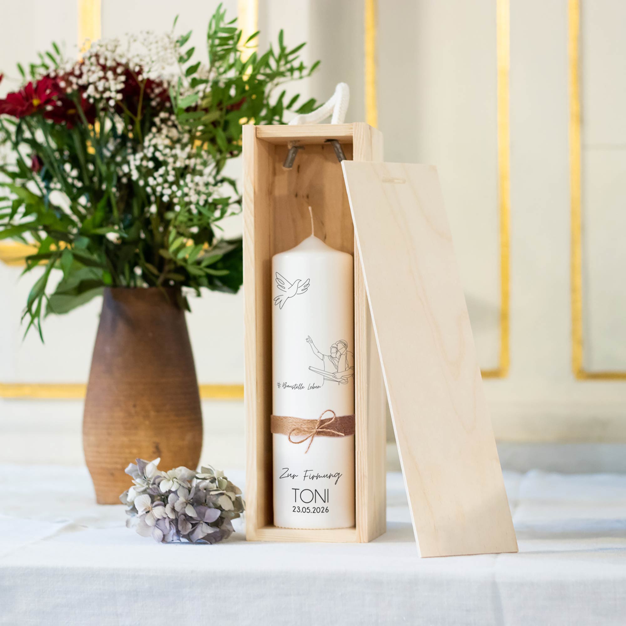 Firmungskerze „Planung – Baustelle Leben 2026“ | personalisiert | mit oder ohne Jutestrick