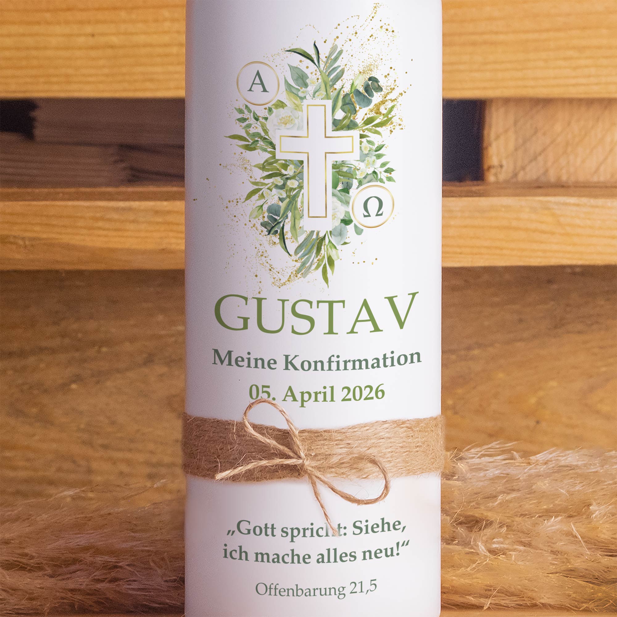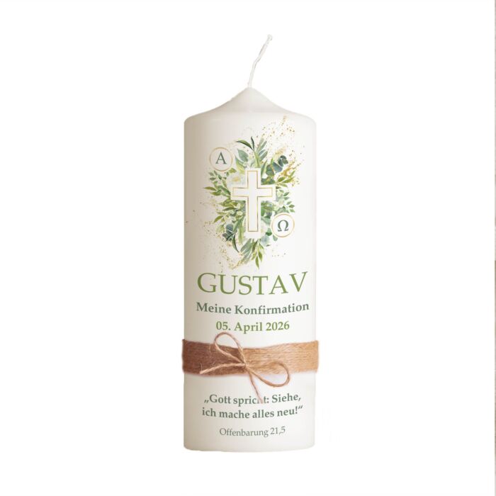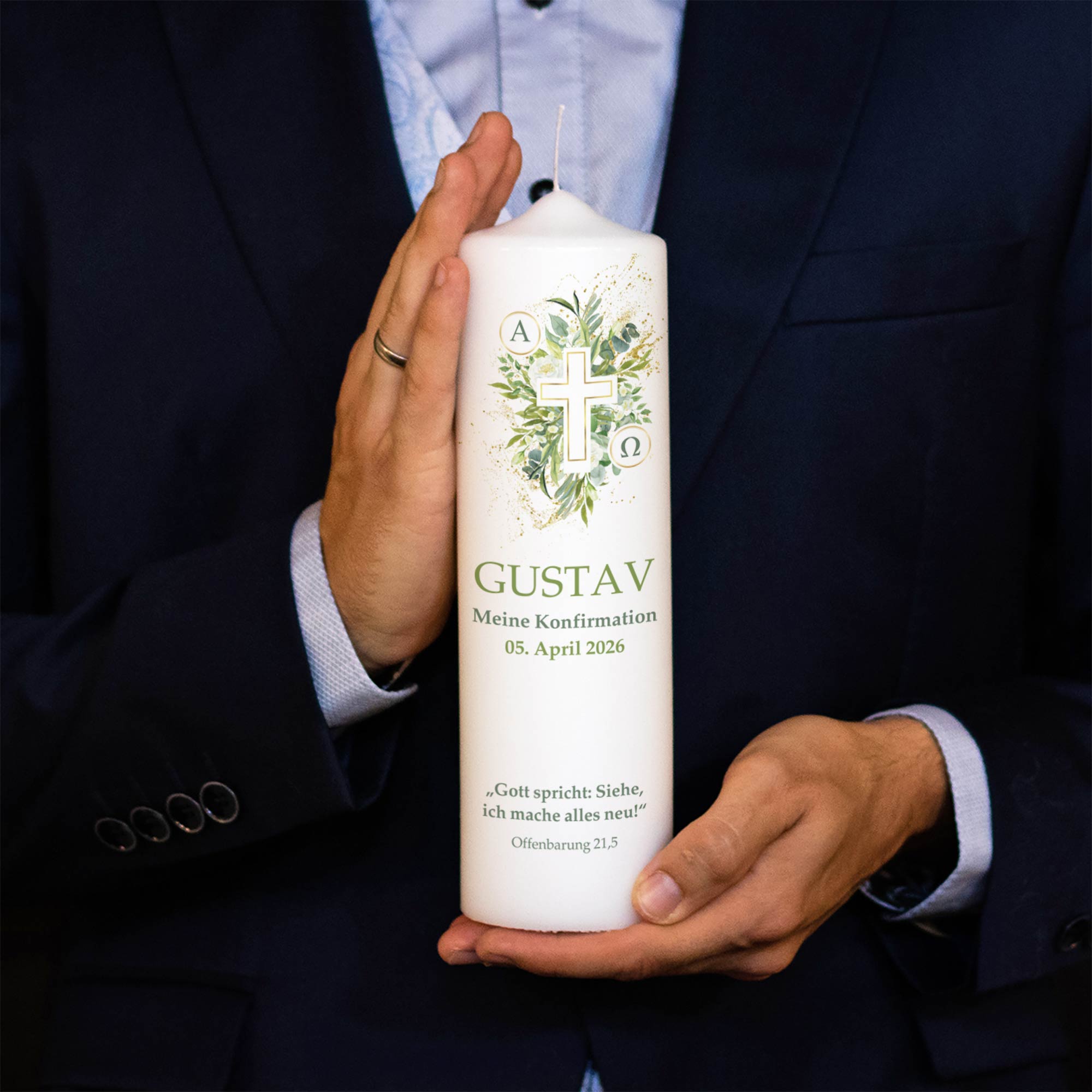Diese moderne Konfirmationskerze „Alpha Omega“ verbindet zeitlose christliche Symbolik mit einer natürlichen, eleganten Gestaltung. Das Kreuz im Mittelpunkt wird von zarten Grün- und Goldakzenten umrahmt, während Alpha (Α) und Omega (Ω) für Anfang und Ende stehen – ein kraftvolles Zeichen für Gottes ewige Begleitung auf dem Lebensweg. Das harmonische Design wirkt ruhig, würdevoll und zugleich modern und macht die Kerze zu einer besonderen Erinnerung an die Konfirmation. Die Kerze wird individuell für dich gestaltet und hochwertig per UV-Direktdruck bedruckt. Das Motiv ist langlebig, farbintensiv und fest mit der Kerze verbunden – keine Folie, kein Abblättern. Du kannst wählen, ob die Kerze pur ohne Verzierung, mit natürlichem Jute-Strick oder mit farbigem Dip und passender Schleife am Kerzenfuß gefertigt werden soll. Wunschname Datum optionaler Bibelvers oder individueller Zusatztext (z. B. „Meine Konfirmation“) Dein Text wird eins zu eins übernommen. Bitte prüfe die Schreibweise sorgfältig. Die Konfirmationskerze ist in folgenden Varianten erhältlich: 15 cm (Ø 7 cm) – ca. 58 Stunden Brenndauer 20 cm (Ø 7 cm) – ca. 83 Stunden Brenndauer 25 cm (Ø 7 cm) – ca. 107 Stunden Brenndauer 30 cm (Ø 7 cm) – ca. 132 Stunden Brenndauer 40 cm Handkerze (Ø 4 cm) – ca. 69 Stunden Brenndauer Kerze mit Teelichteinsatz – 28 cm hoch, Ø 6,8 cm Unsere Kerzen bestehen aus hochwertigem Wachs, tragen das RAL-Gütezeichen, sind rußarm, tropffrei und für einen sicheren Abbrand geprüft. Alle Kerzen werden mit viel Sorgfalt in unserer Kerzenwerkstatt handgefertigt.