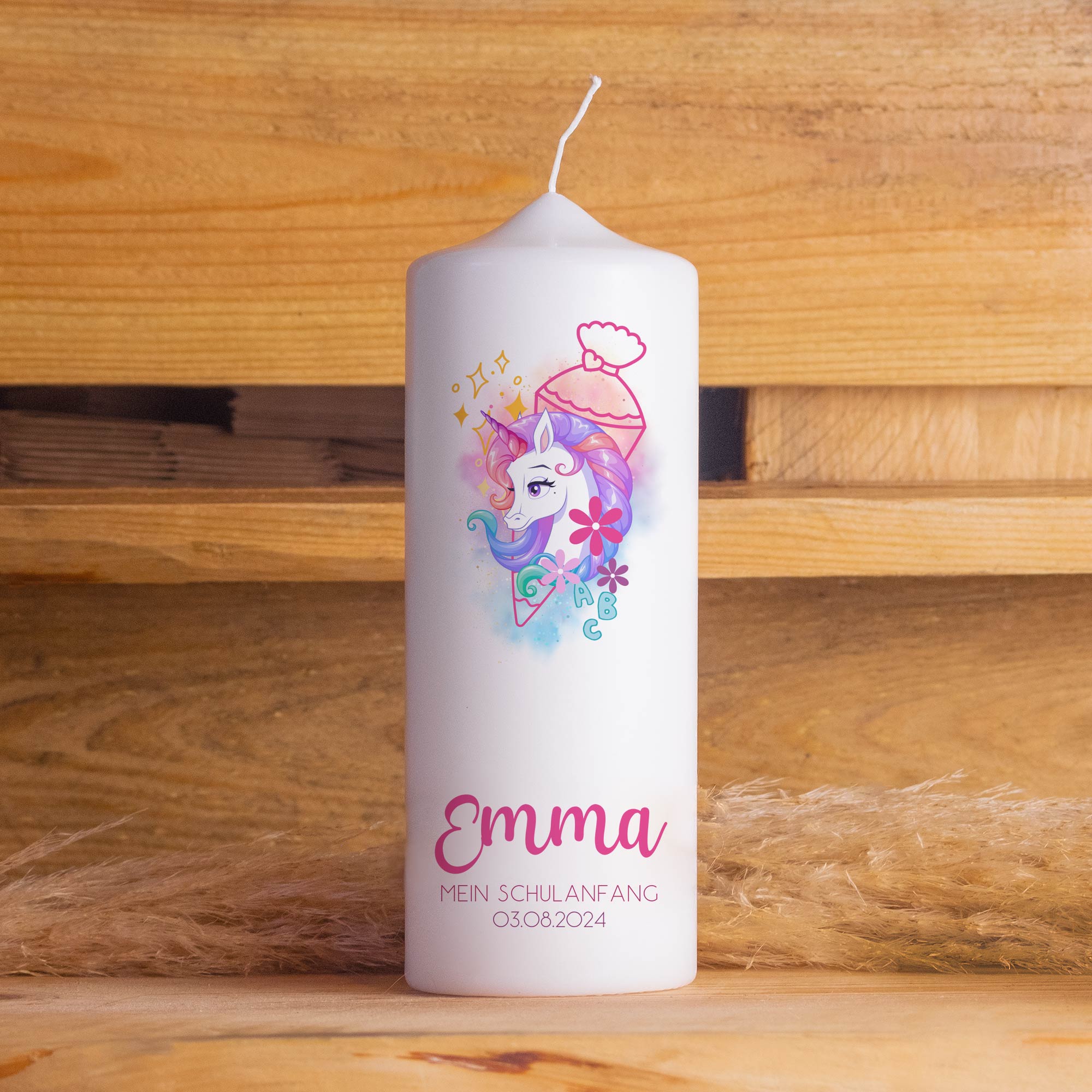 Schulanfangskerze Einhorn | Personalisierte Kerze zur Einschulung | 15–30 cm | Mit Name, Datum & Jutestrick