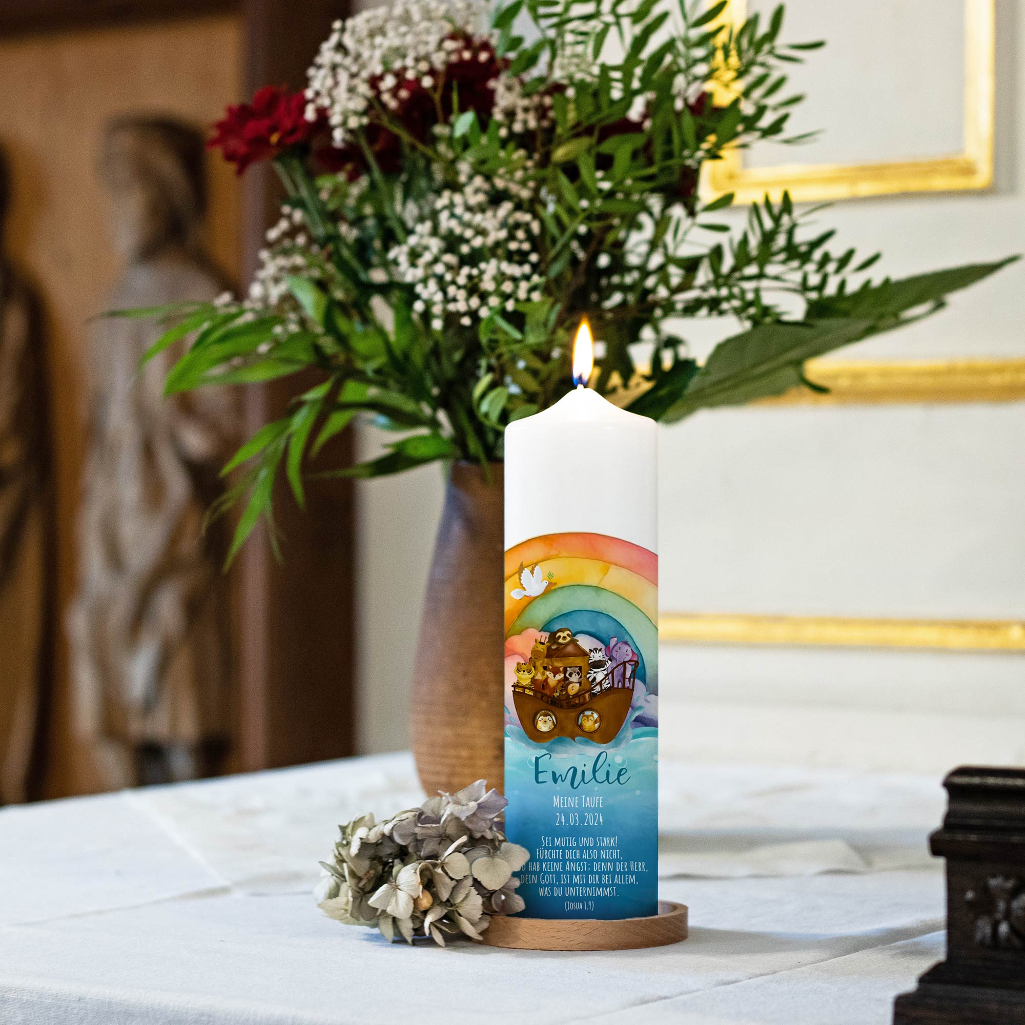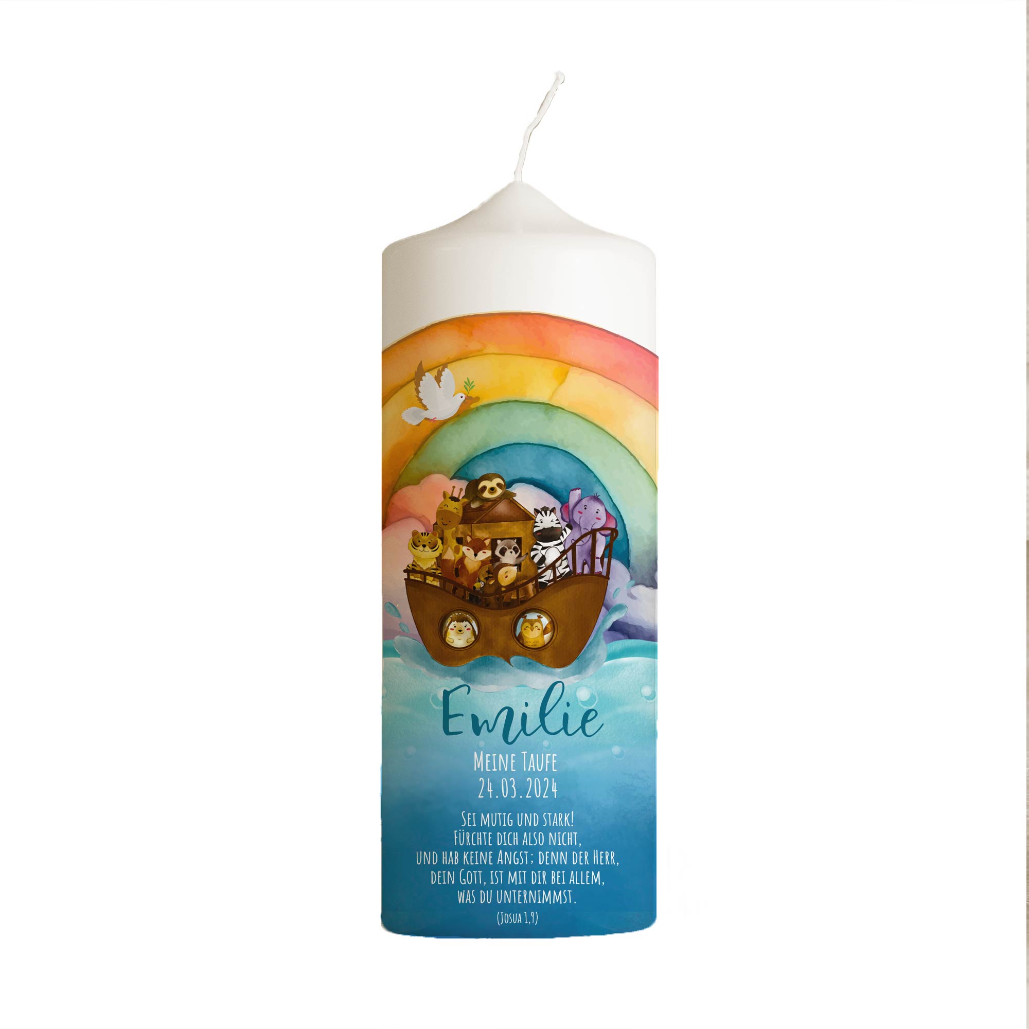 1 Rezension für Taufkerze | Arche Ozean | Arche Noah | Boot | Regenbogen | Rundumdruck | 25-30 cm Höhe | Personalisiert