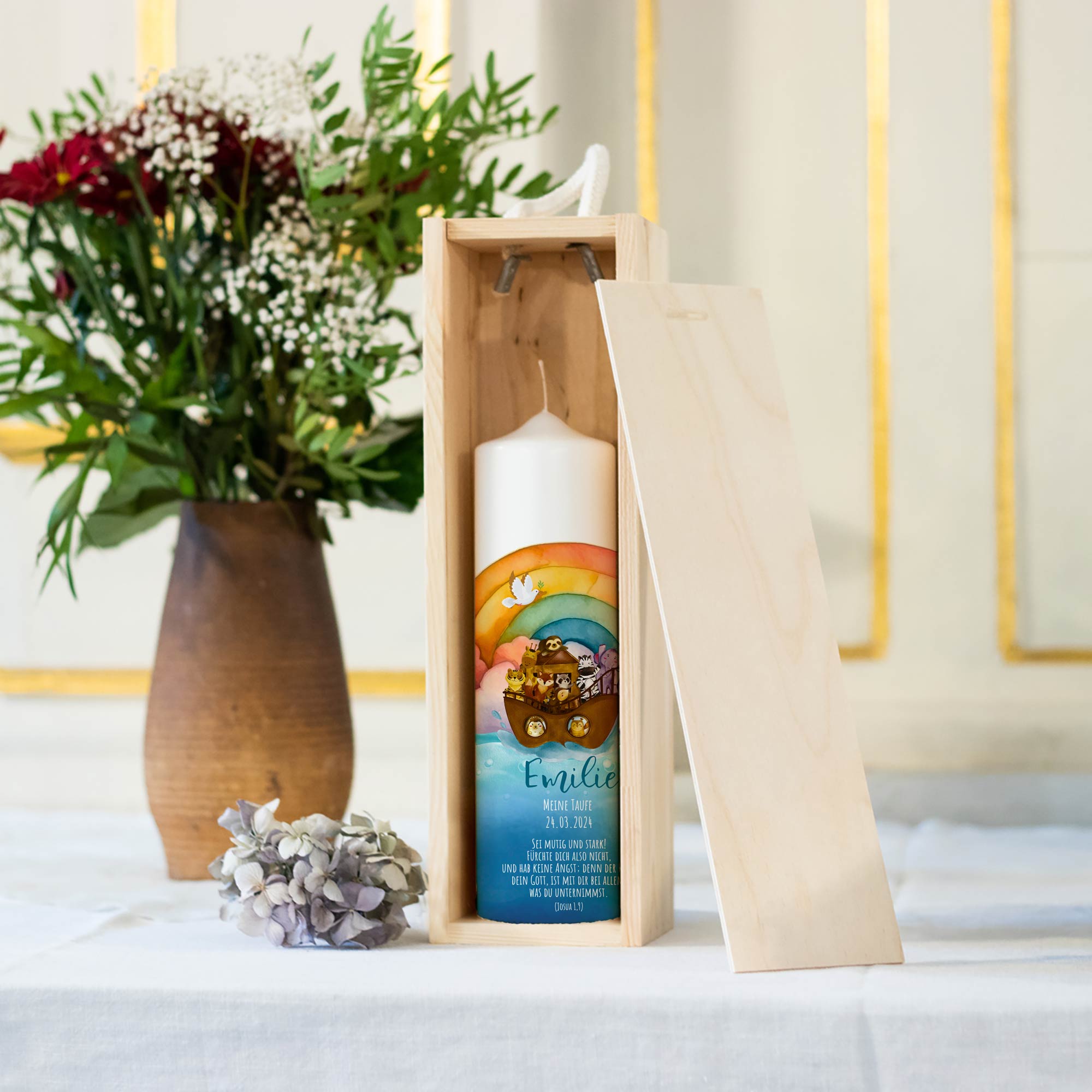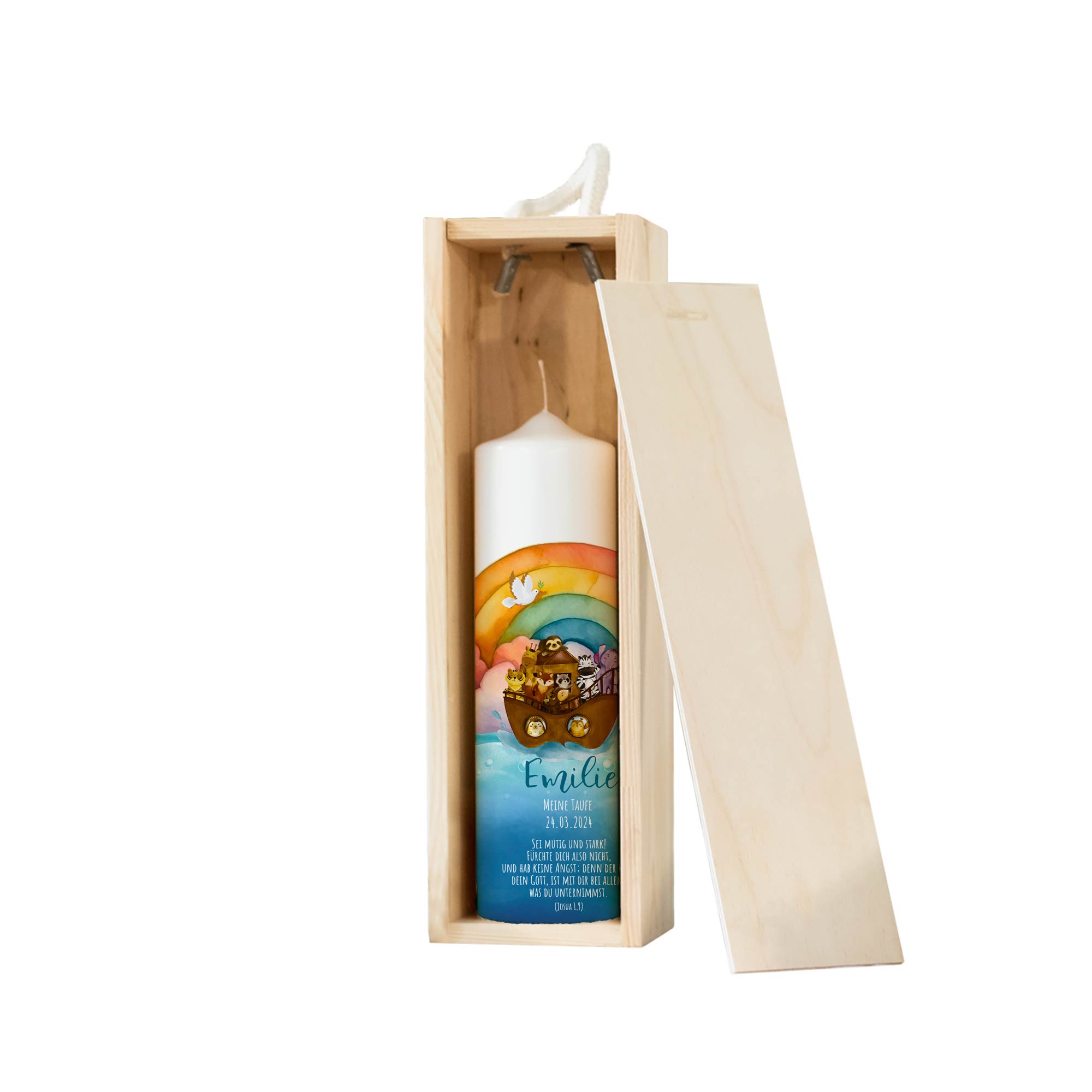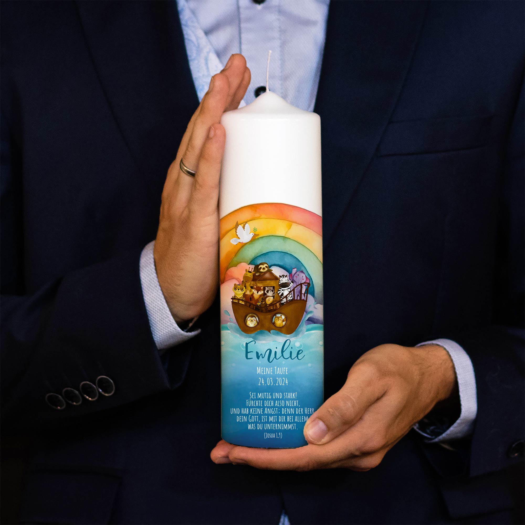 Diese wunderschöne Kerze mit Rundumdruck ist das perfekte Geschenk zur Taufe. Mit dem individuellen Namen, Datum und dem hübschen Motiv mit Arche und Regenbogen passt diese Kerze wunderbar zu jeder Taufzeremonie und wird danach zu einem schönen Erinnerungstück. ♡ Besonderes Taufgeschenk: Personalisierte Taufkerze mit Namen Lange Brenndauer: Es handelt sich um einen hochwertigen Druck und nicht um Folie! Unsere Kerzen werden in Deutschland nach RAL Kerzengüte Qualität hergestellt. Das RAL Kerzenqualitätssiegel garantiert Dir einen sicheren und rußfreien Abbrand. So gehst du vor: Bei speziellen Wünschen kannst du uns jederzeit gern kontaktieren! Willst du gerne einen Spruch auf der Rückseite, füge bitte folgenden Artikel deiner Bestellung hinzu: Zubehör wie Kerzenuntersetzer findest du hier: Wir versenden CO2 neutral! Unsere Kerzen werden in liebevoller Handarbeit hergestellt, weshalb es zu Abweichungen kommen kann. Unsere Kerzen sind perfekt als: Taufgeschenk