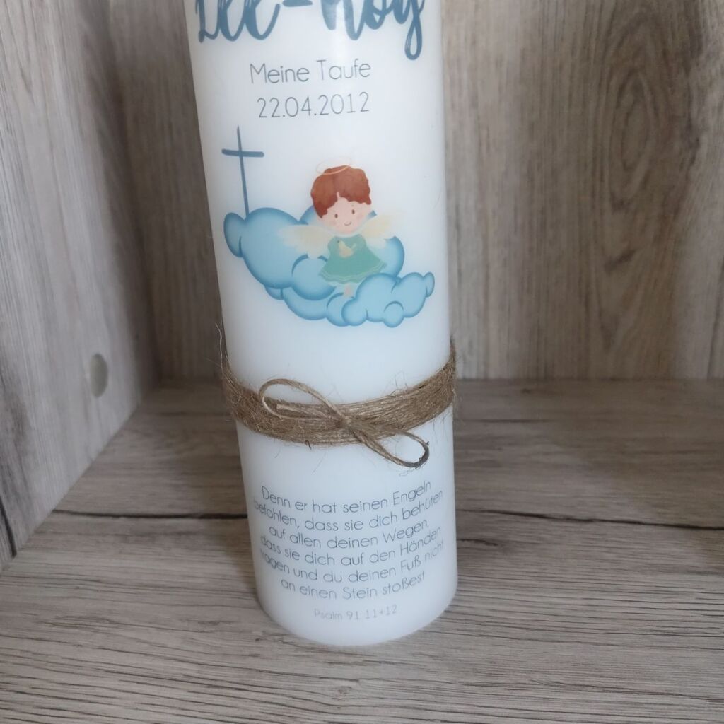 Diese wunderschöne Kerze ist das perfekte Geschenk zur Taufe. Mit dem individuellen Namen, Datum und dem hübschen Motiv mit Engel, Wolken und Kreuz passt diese Kerze wunderbar zu jeder Taufzeremonie und wird danach zu einem schönen Erinnerungstück. ♡ Besonderes Taufgeschenk: Personalisierte Taufkerze mit Namen Lange Brenndauer: Es handelt sich um einen hochwertigen Druck und nicht um Folie! Unsere Kerzen werden in Deutschland nach RAL Kerzengüte Qualität hergestellt. Das RAL Kerzenqualitätssiegel garantiert Dir einen sicheren und rußfreien Abbrand. So gehst du vor: Bei speziellen Wünschen kannst du uns jederzeit gern kontaktieren! Willst du gerne einen Spruch auf der Rückseite, füge bitte folgenden Artikel deiner Bestellung hinzu: Zubehör wie Kerzenuntersetzer findest du hier: Wir versenden CO2 neutral! Unsere Kerzen werden in liebevoller Handarbeit hergestellt, weshalb es zu Abweichungen kommen kann. Unsere Kerzen sind perfekt als: Taufgeschenk